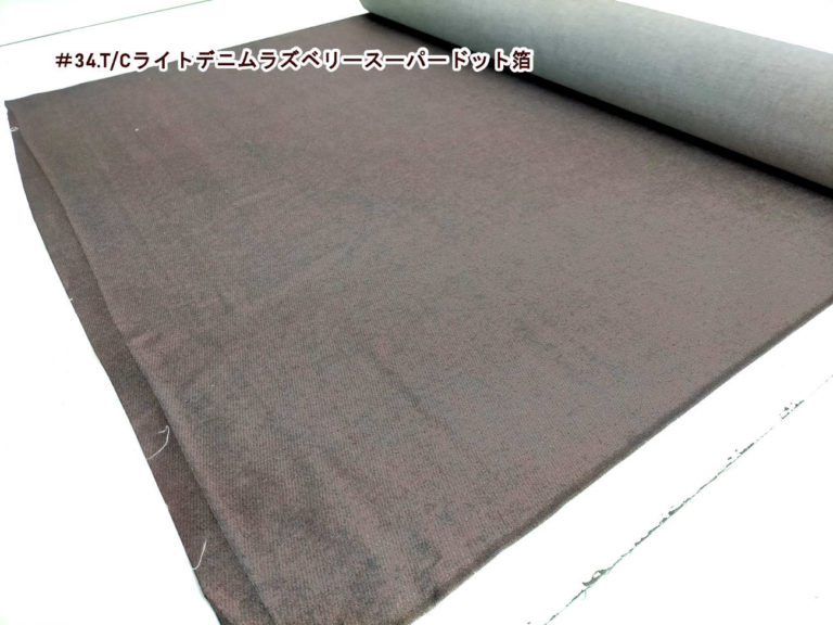 通常のショップでは、説明できない部分を詳しく掘り下げて説明していきます。 当商品は、推定約5オンスの薄手のT/Cライトデニムにラズベリー色のドットラメ箔を加工しています。 赤茶系のメタリックデニムです。