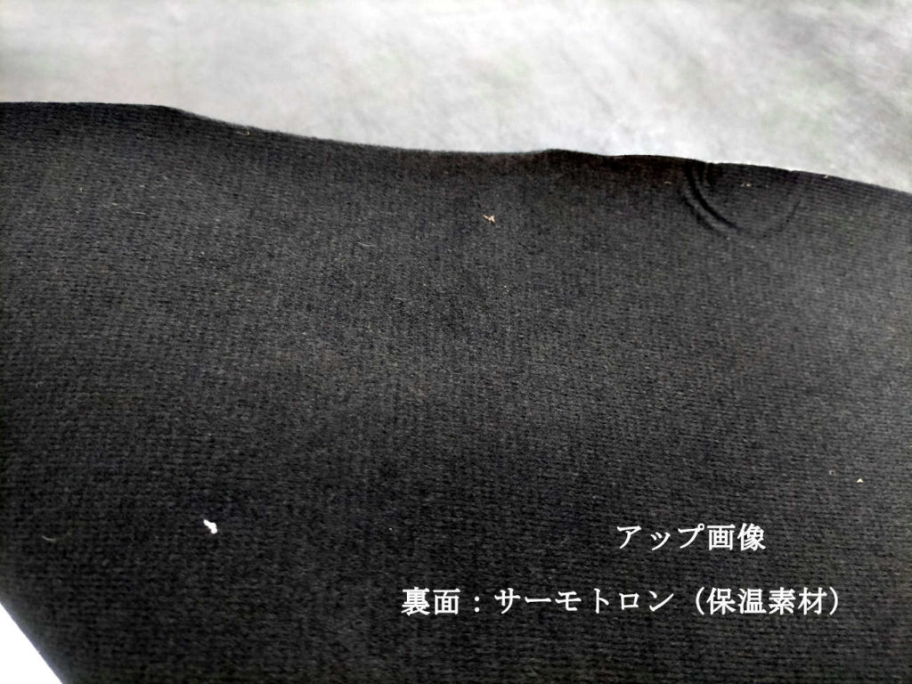 当商品は、表の人工皮革タイプと裏面の蓄熱保温繊維サーモトロンを合せ加工しています。